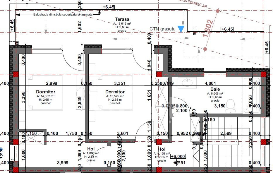 Etaj retras: 2 dormitoare cu acces pe o terasa generoasa si priveliste catre oras, o baie cu geam.