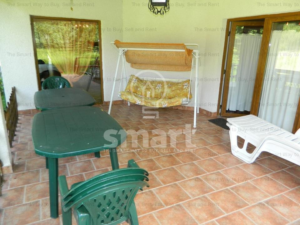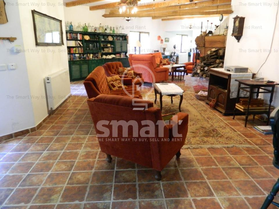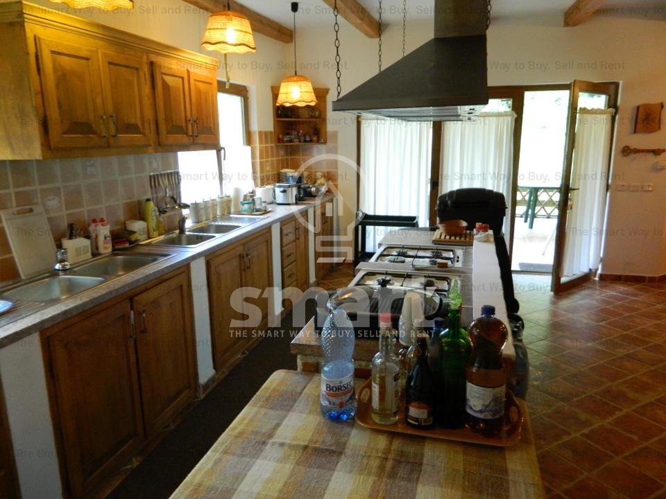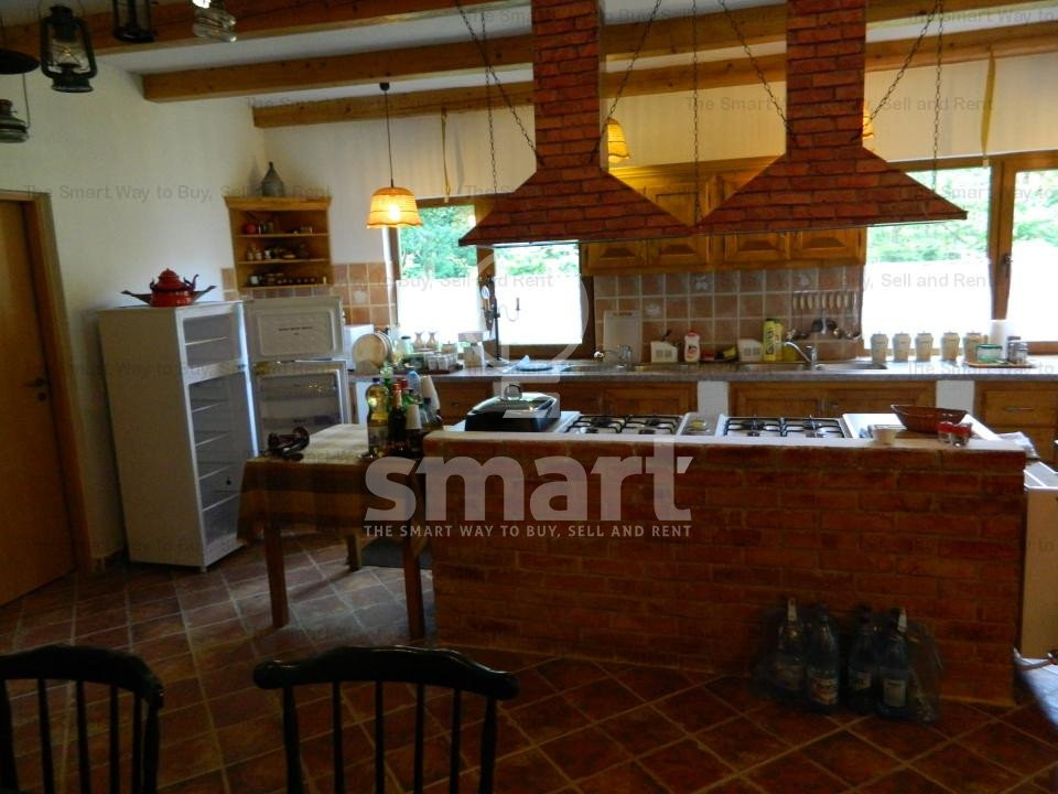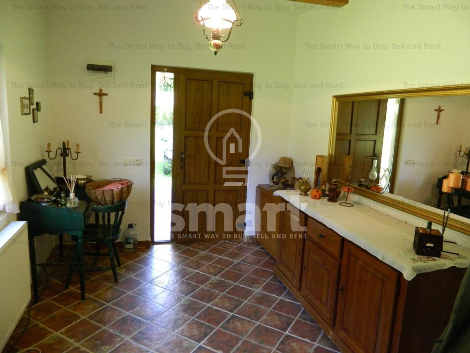 Interiorul impresionează prin mobilierul din lemn masiv, unele piese fiind atent alese din import, care completează perfect atmosfera caldă și primitoare. Punctul central al livingului este șemineul spectaculos, încadrat de bârne masive de stejar, ce adaugă un plus de caracter și autenticitate întregii locuințe.